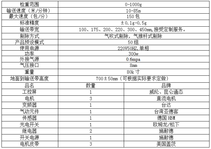 微電腦將顯示的計量數據與預設的基準值、上限值、下限值進行比較,并進行正品、超重品、輕欠品的辨別,重量不合格品被分選部分選出,